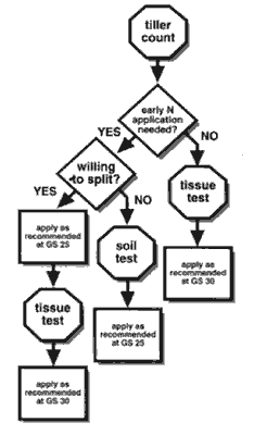 Optimum N fertilization from January until jointing is absolutely essential to profitable wheat production. Research has shown that fall/early winter fertilization is generally very important to early tiller development. Tillers developed in the fall or winter produce greater numbers of wheat kernels per head than tillers developed in the spring. Fall/winter developed tillers also have deeper root systems that give greater protection against dry weather during grain fill in May or early June. Nitrogen timing and rate should be adjusted based on residual nitrogen available to the plant and time of planting. If the crop has already developed 100 or more tillers per square foot with three or more leaves in early February, (this will only happen in timely planted wheat with relatively large amounts of residual nitrogen) the crop does not need additional nitrogen until at least March. When wheat has 50-100 tillers per square foot it is desirable to apply only 30-40 pounds of nitrogen in January/February. Conversely, if wheat has less than 50 tillers per square foot, 40-50 pounds of nitrogen per acre should be applied as soon as possible to stimulate growth and tillering on any winter days when the air temperature averages above 32 degrees. Early February is too early to apply more than 50-60 pounds of nitrogen on most soils. See the figure below for the steps of how to obtain field-specific N rate recommendations for late winter/early spring N applications. A tiller count should be the first step in all fields, regardless of whether spring N applications will be split or not; then follow the arrows. For details of the research and nitrogen recommendations for wheat obtain a copy of Nitrogen Management for Winter Wheat: Principles and Recommendations by Dr. Mark Alley from your local extension agent or on-line at http://www.ext.vt.edu/pubs/grains/424-026/424-026.